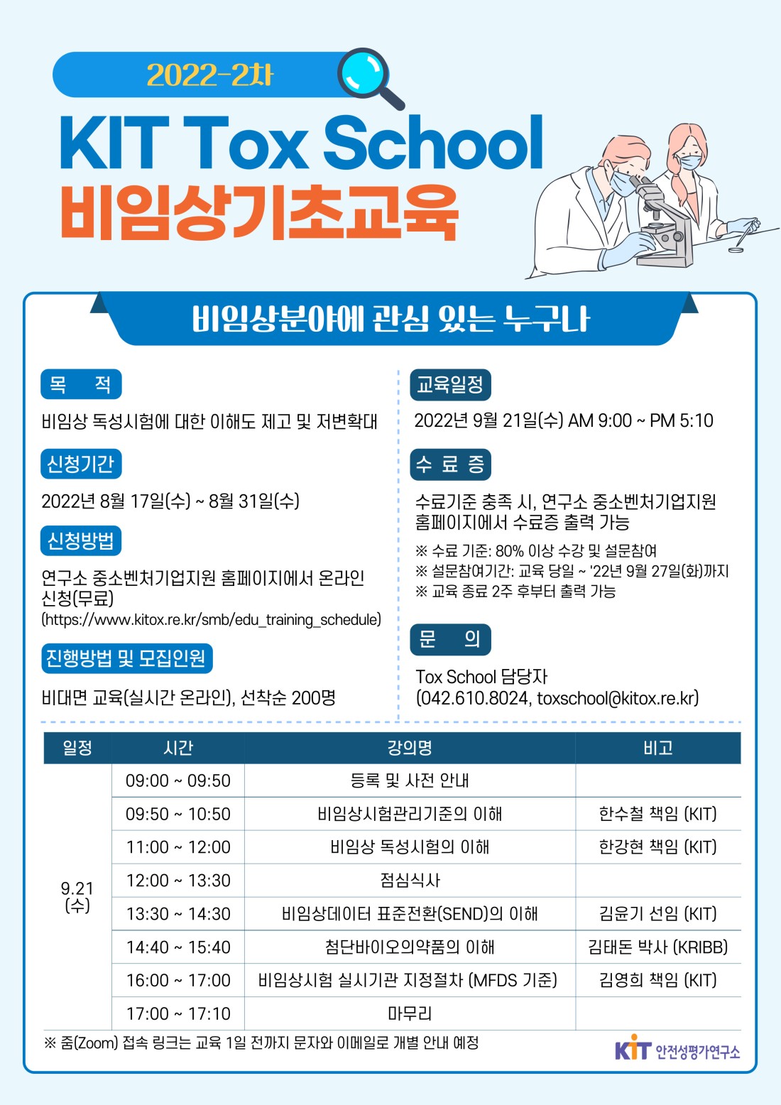 공지 2022-2차 『KIT Tox School』비임상 기초교육 개최 안내