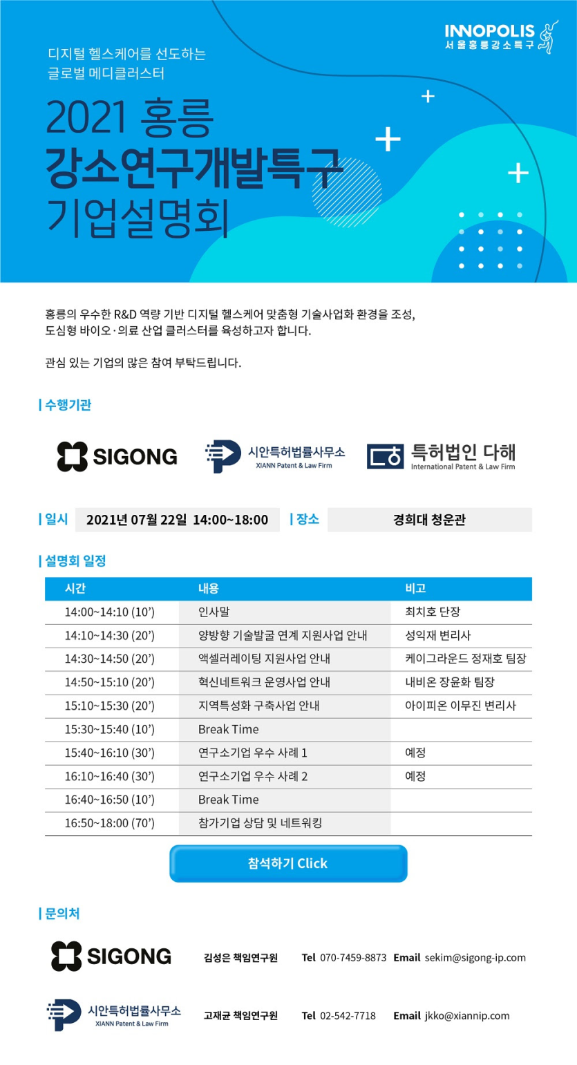 2021 홍릉 강소연구개발특구 기업설명회 교육 모집기간 2021-07-22~2021-07-22 모임기간 2021-07-22, 14시~18시 모임장소 경희대 청운관 지원자격 홍릉강소연구개발특구에 관심 있는 기업 기타 홍릉 강소연구개발특구에 대한 설명회 진행 페이지 정보 작성자 홍릉강소특구사업단 운영자 댓글 0건 조회 135회 작성일 21-11-01 10:12 목록으로 신청하기 본문 상세 정보 목록