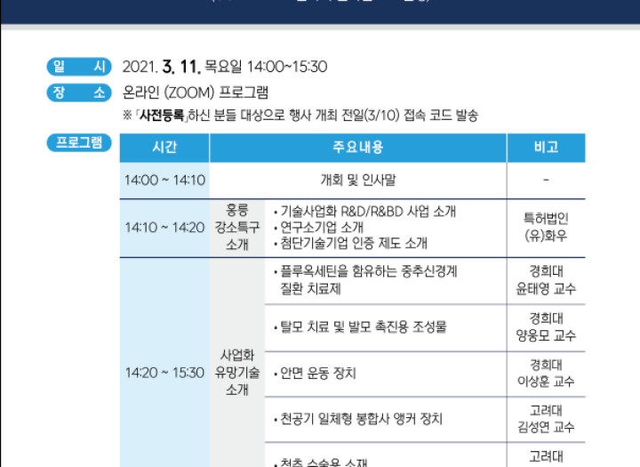 서울 홍릉강소특구 사업 및 사업화 유망기술 온라인 설명회 교육 모집기간 2021-03-11~2021-03-11 모임기간 2021-03-11, 목요일 모임장소 온라인 ZOOM 지원자격 서울 홍릉강소특구에 관심이 있는 누구나 기타 서울 홍릉강소특구 활성화를 위하여 2021년 서울 홍릉강소특구 사업 및 사업화 유망기술 온라인 설명회를 개최 교육 페이지 정보 작성자 홍릉강소특구사업단 운영자 댓글 1건 조회 173회 작성일 21-11-04 10:36 목록으로 신청하기 본문 상세 정보 목록 게시판 리스트 옵션 검색 닫기
