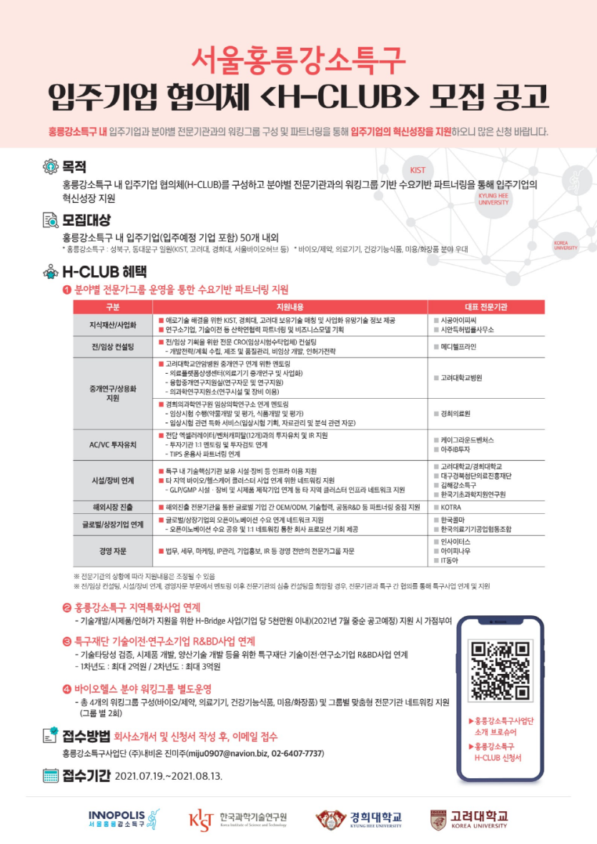 서울홍릉강소특구 입주기업 협의체 <H-CLUB> 모집 협의체 모집기간 2022-07-19 모임기간 상시 모집 진행 중 모임장소 지원자격 홍릉강소특구 내 입주 되어있는 기업 기타 홍릉강소특구 내 입주기업과 분야별 전문기관과의 워킹그룹 구성 및 파트너링을 통해 입주기업의 혁신성장 지원 페이지 정보 작성자 홍릉강소특구사업단 운영자 댓글 1건 조회 237회 작성일 22-01-03 14:15 목록으로 신청하기 본문 상세 정보 목록