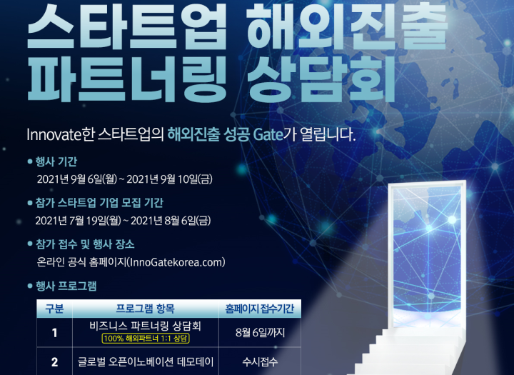 스타트업 해외진출 파트너링 상담회 네트워킹 모집기간 2021-07-19~2021-08-06 모임기간 2021-09-06(월) ~ 2021-09-10(금) 모임장소 지원자격 기타 스타트업의 해외진출을 돕기 위한 파트너링 상담회 진행 네트워킹 페이지 정보 작성자 홍릉강소특구사업단 운영자 댓글 0건 조회 117회 작성일 22-01-03 14:28 목록으로 신청하기 본문 상세 정보 목록