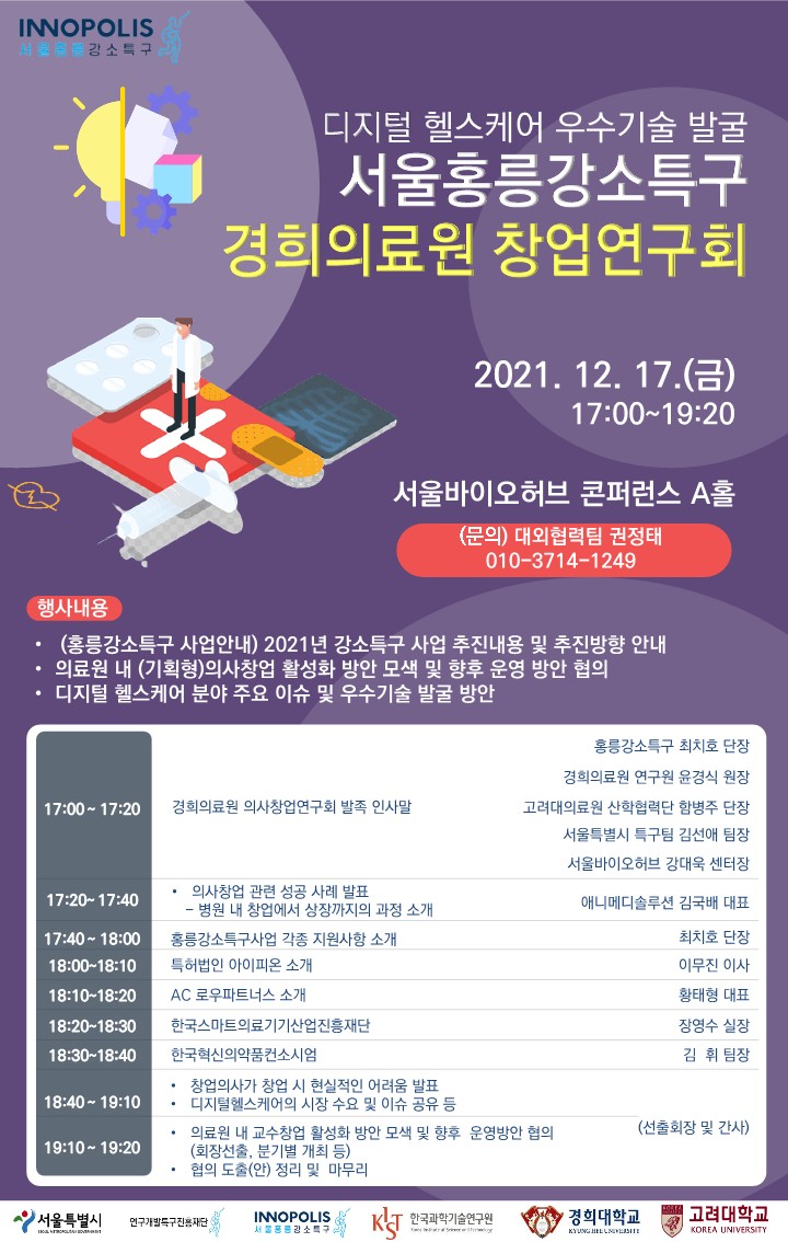 서울홍릉강소특구 경희의료원 창업연구회 발대식 교육 모집기간 2021-12-17~2021-12-17 모임기간 2021-12-17 / 금요일 17 모임장소 서울바이오허브 콘퍼런스 A홀 지원자격 기타 서울홍릉강소특구 경희의료원 창업연구회 발대식 진행 교육 페이지 정보 작성자 홍릉강소특구사업단 운영자 댓글 0건 조회 215회 작성일 22-01-26 14:52 목록으로 신청하기 본문 상세 정보 목록