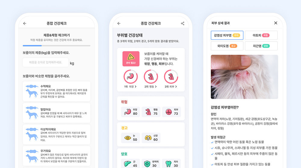비대면 문진의 경우 총 20가지 문항을 통해 건강에 영향을 미치는 품종, 나이, 과거 병력, 현재 증상, 라이프스타일을 확인한다. 이를 기반으로 전반적인 건강 상태나 심장, 위장, 치아 등 10가지 부위별로 건강 점수를 계산한다. 자체 개발한 알고리즘을 통해 정확도를 높인 것 또한 특징이다. 80개체를 대상으로 테스트한 결과 92.8% 유효성을 검증했다.